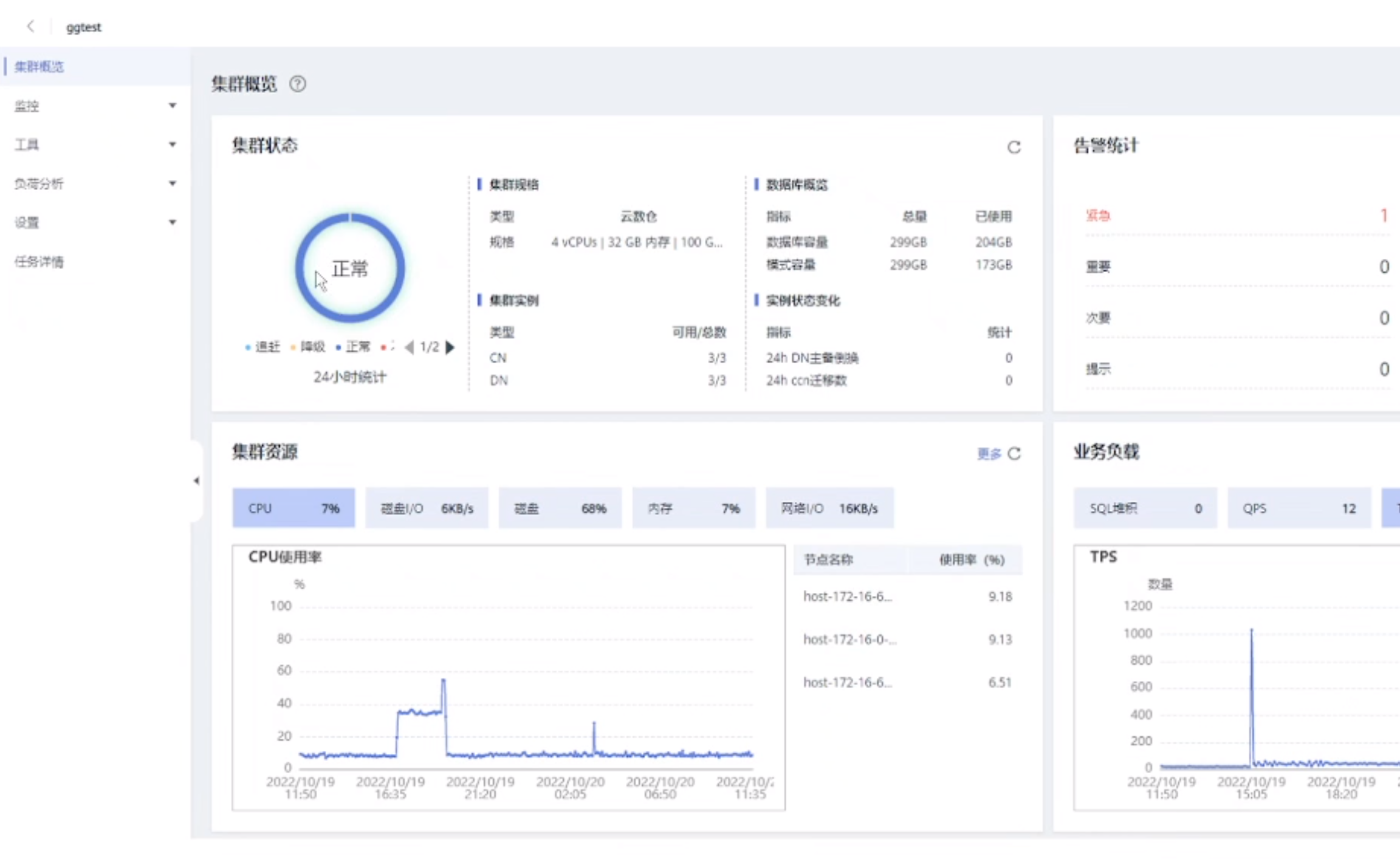 首先我们先创建一个初始化好的集群,可以看到【集群状态】当前的状态是可用的,但是当出现异常后对应的状态就会随之改变。集群的基础信息都会在这个页面显示。