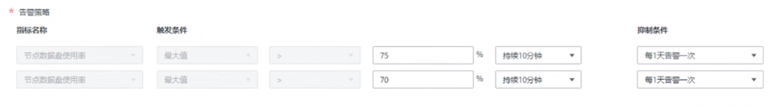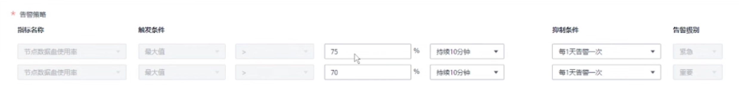 节点盘使用率这里是时长会出现告警的位置,我们可以根据具体业务逻辑判断对应的设置。