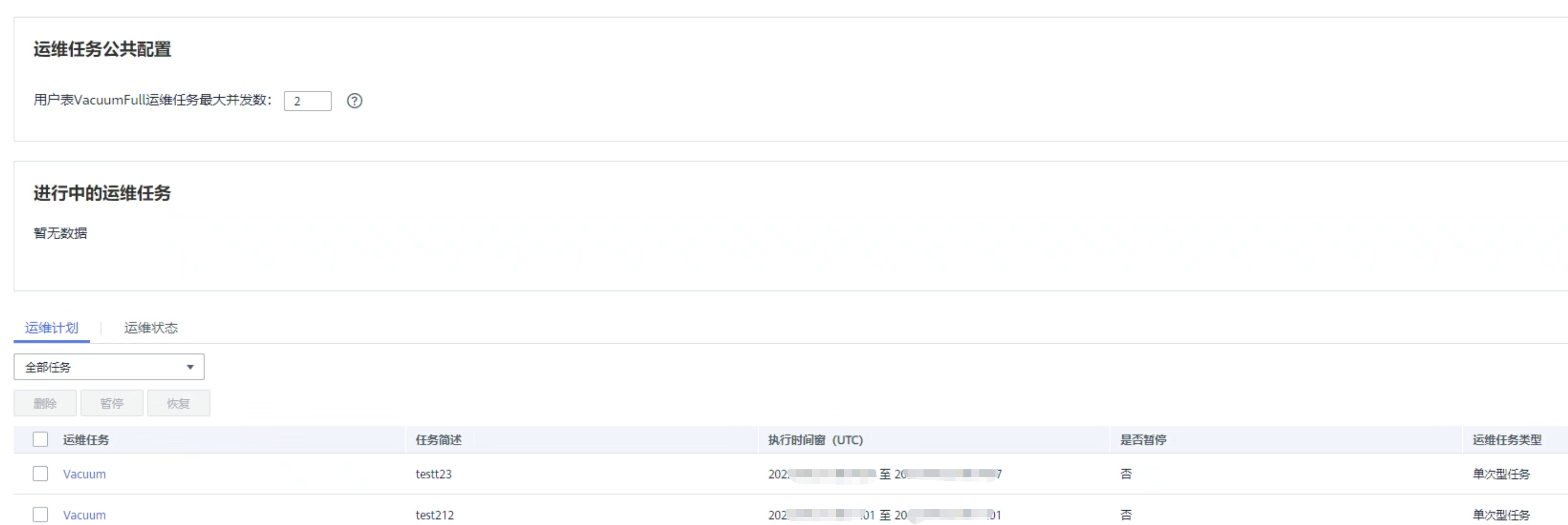 - 运维任务公共配置:目前仅包含“用户表VacuumFull运维任务最大并发数”,该配置应用于每个用户表VacuumFull的运维任务。