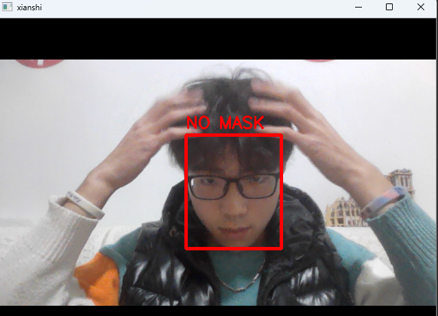 1.使用PaddlenHub模块指定算法,根据面部特征的上下左右来判断是否面部有物体遮挡,并判断遮挡区域及位置,若判断条件成功,则绘制绿色矩形及英文提示。若判断条件失败,则绘制红色矩形及英文提示!