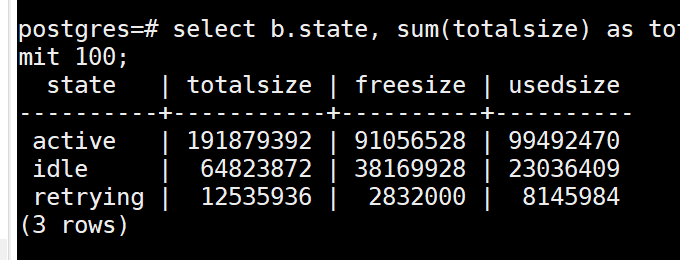 select b.state, sum(totalsize) as totalsize, sum(freesize) as freesize, sum(usedsize) as usedsize from pv_session_memory_detail a , pg_stat_activity b where split_part(a.sessid,'.',2) = b.pid group by b.state order by totalsize desc limit 100;