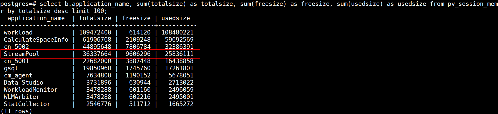 select b.application_name, sum(totalsize) as totalsize, sum(freesize) as freesize, sum(usedsize) as usedsize from pv_session_memory_detail a , pg_stat_activity b where split_part(a.sessid,'.',2) = b.pid group by b.application_name order by totalsize desc limit 100;