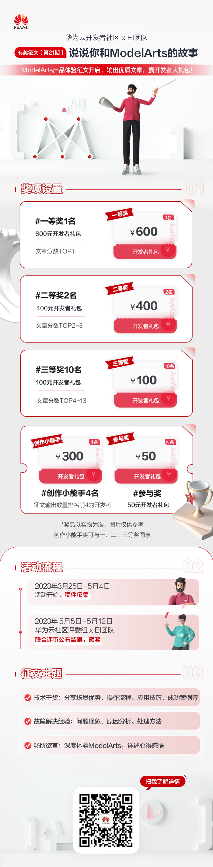 为了让广大的开发者朋友们可以近距离地体验、交流ModelArts,我们特举办本次ModelArts征文活动,邀请大家分享自己在学习、使用ModelArts产品过程中的心得与体验,你所了解的ModelArts技术架构、代码调试经验、训练技巧、故障解决经历、学习过程、反馈建议等等,都可以与我们分享。