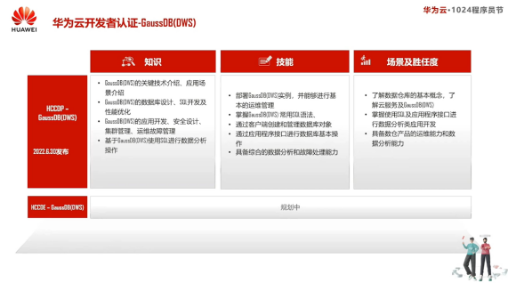 华为云开发者认证-GaussDB(DWS)是一个专注于华为云上的分布式数据库产品GaussDB(DWS)的开发者认证。该认证是面向有意向使用GaussDB(DWS)产品开发和管理的开发者和技术专家,证明其掌握了GaussDB(DWS)的相关技术知识和能力。