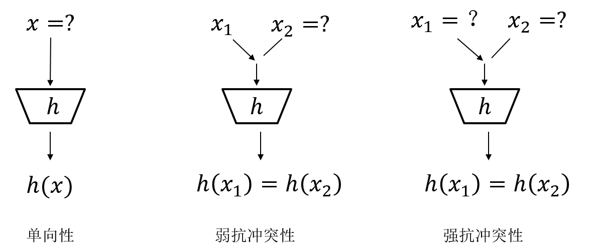 - 抗第一原像性(单向性):给定一个输出z,找到满足h(x)=z的输入x是不可能的,即h(x)具有单向性;