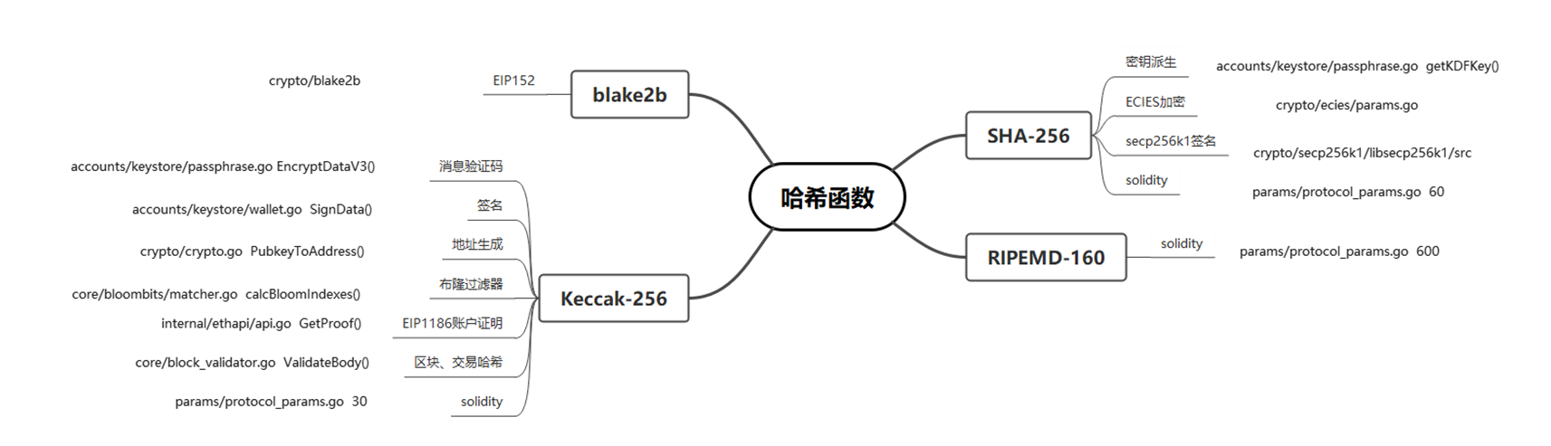 在以太坊中常用的哈希函数有KeccaK-256、SHA-256、RIPEMD-160、Blake2b,主要用于计算区块和交易的摘要、Merkle Patricia Tree、工作量证明、签名、计算地址、合约等,整理了在以太坊源码中上述哈希函数所对应的功能及代码目录。