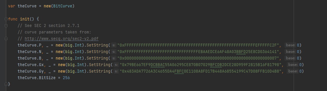以太坊使用的椭圆曲线有secp256k1、bls12_381、bn256等,下面为源码中secp256k1的椭圆曲线参数。