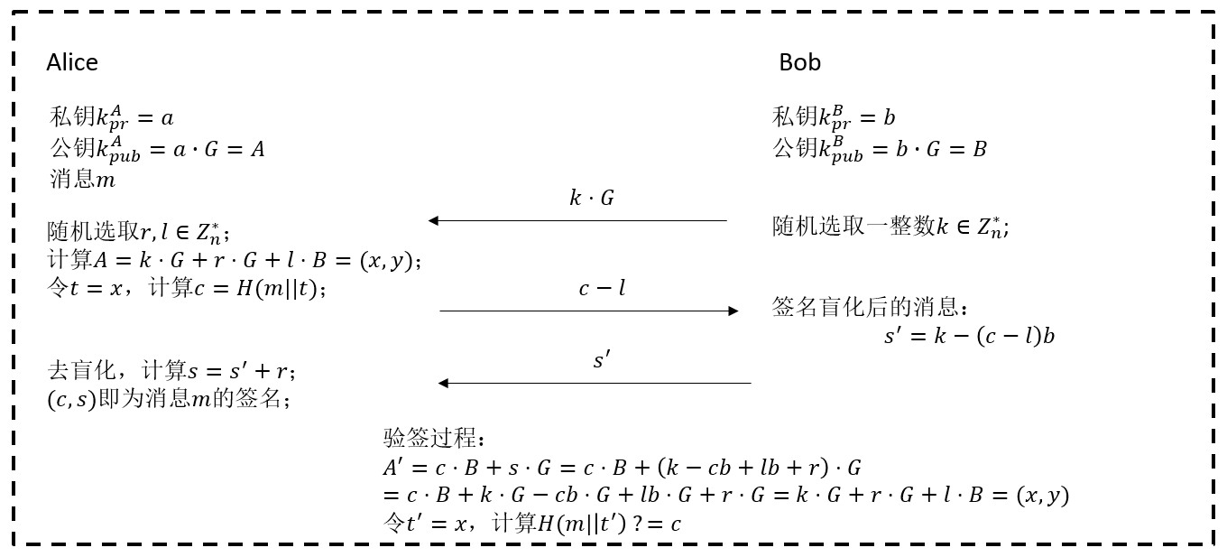 签名者Bob每次盲签名都会新生成一对临时签名公私钥对,用户Alice想让签名者对消息m进行盲签名,流程如下:
