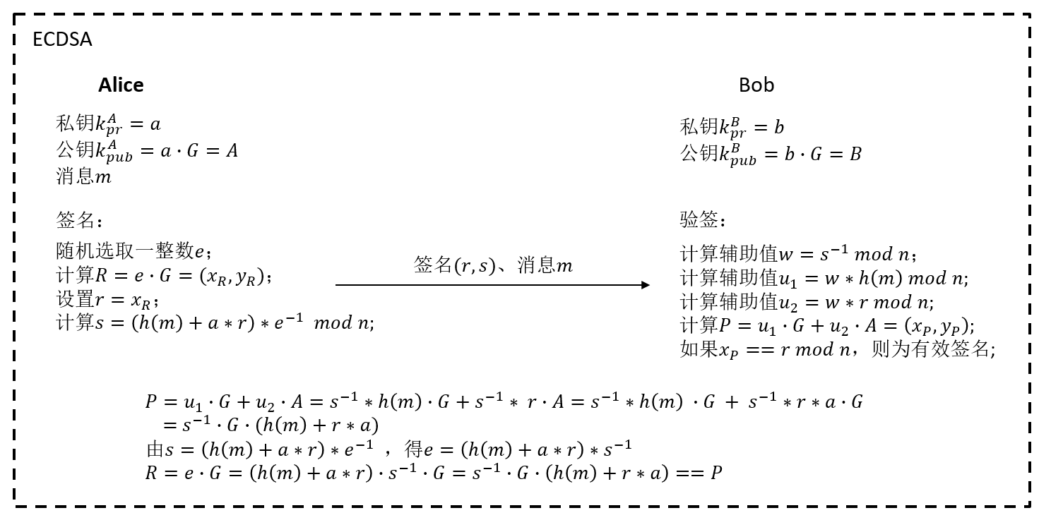 ECDSA(Elliptic Curve Digital Signature Algorithm)是一种从从椭圆曲线密码学派生的数字签名算法,算法过程如下: