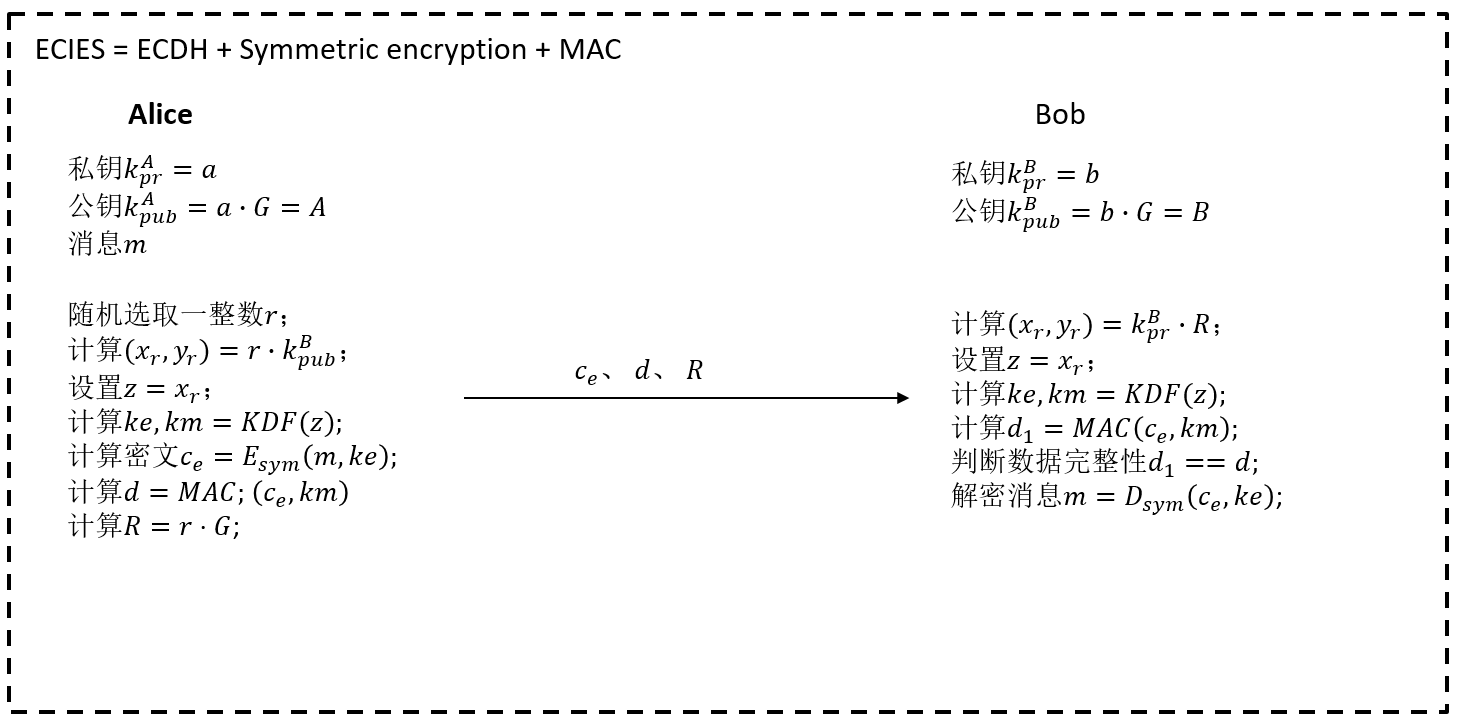 ECIES(Elliptic Curve Integrated Encryption Scheme)为基于椭圆曲线的整合加密方案,可以理解成集成了ECDH + Symmetric encryption + MAC,具体算法过程如下:其中模数为p,素数阶为n,生成元为G
