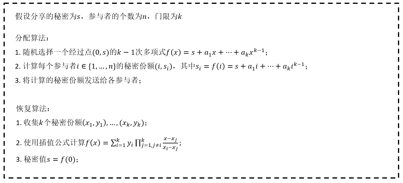 本贴介绍下经典的秘密共享方案Shamir门限秘密共享,过程如下: