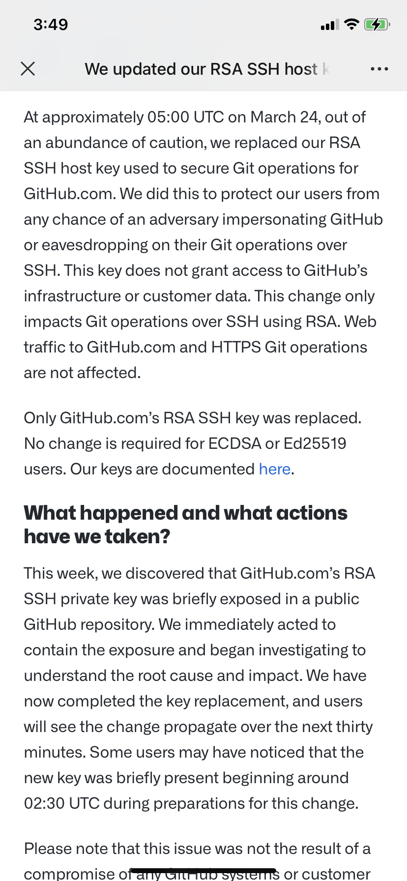 再去社区查了下,原来3月23号ssh key 也上级了。[SSH key 也要升级] (https://github.blog/2023-03-23-we-updated-our-rsa-ssh-host-key/)