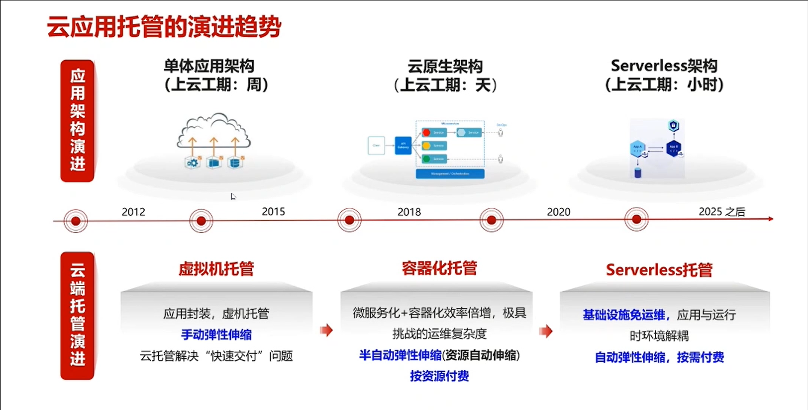 2. 云原生架构,这种方式上云周期:天。容器化托管:微服务化+容器化效率倍增,极具挑战的运维复杂度。半自动弹性伸缩(资源自动伸缩),按资源付费,资源有时是独占的,在这个过程中,资源利用率比较低。