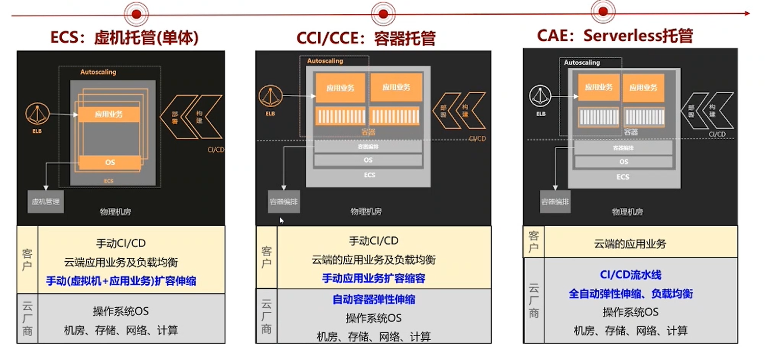 云厂商提供操作系统 OS,机房、存储、网络、计算。对于客户来说,需要 CI/CD,云端应用业务及负载均衡,手动(虚拟机+应用业务)扩容伸缩