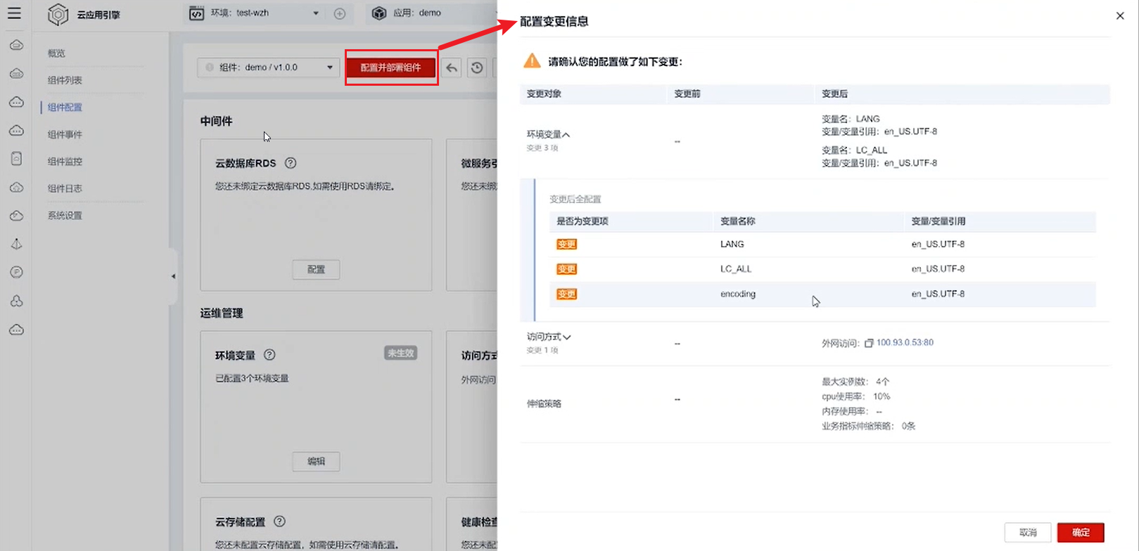 回到界面上方,单击“配置并部署组件”,可以看到配置变更信息,单击“确定”,确认配置信息。: