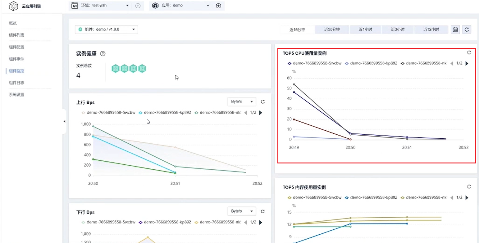 • 单击“组件监控”,显示当前组件运行的实例数,以及各个实例的cpu和内存的使用情况。