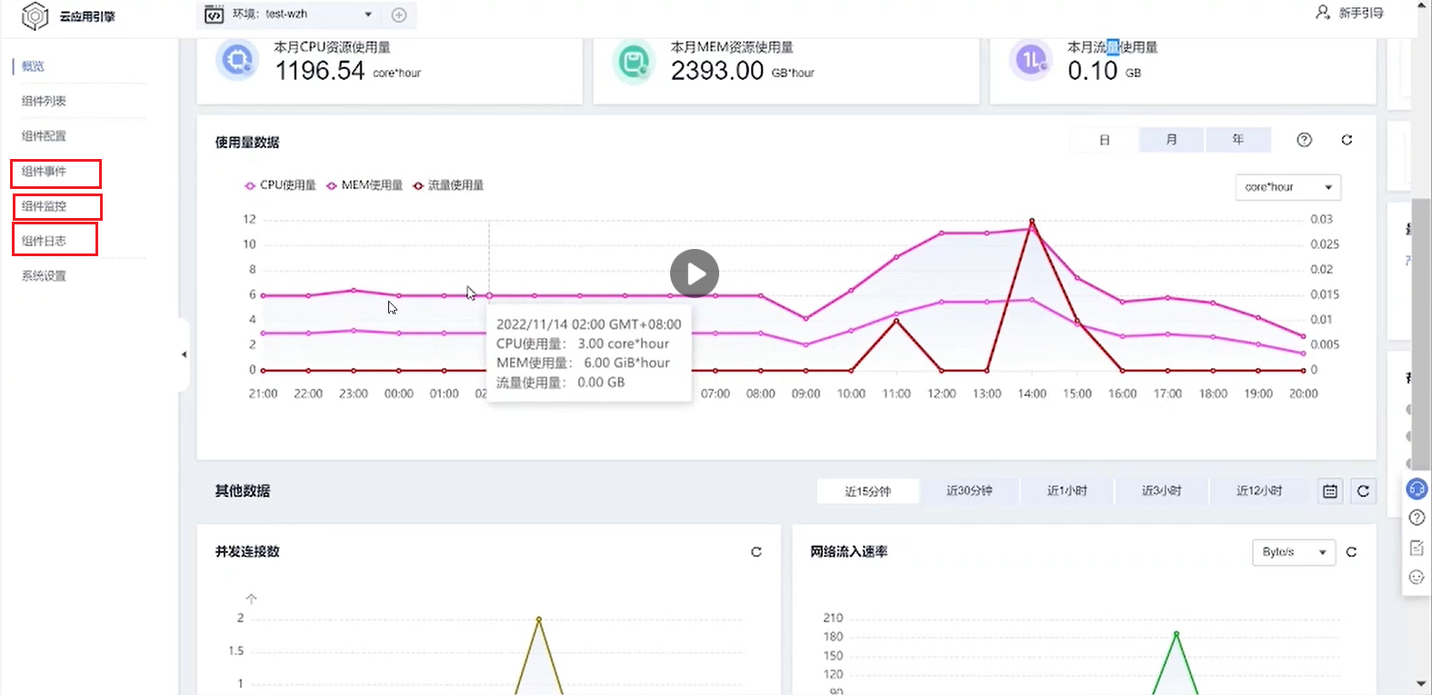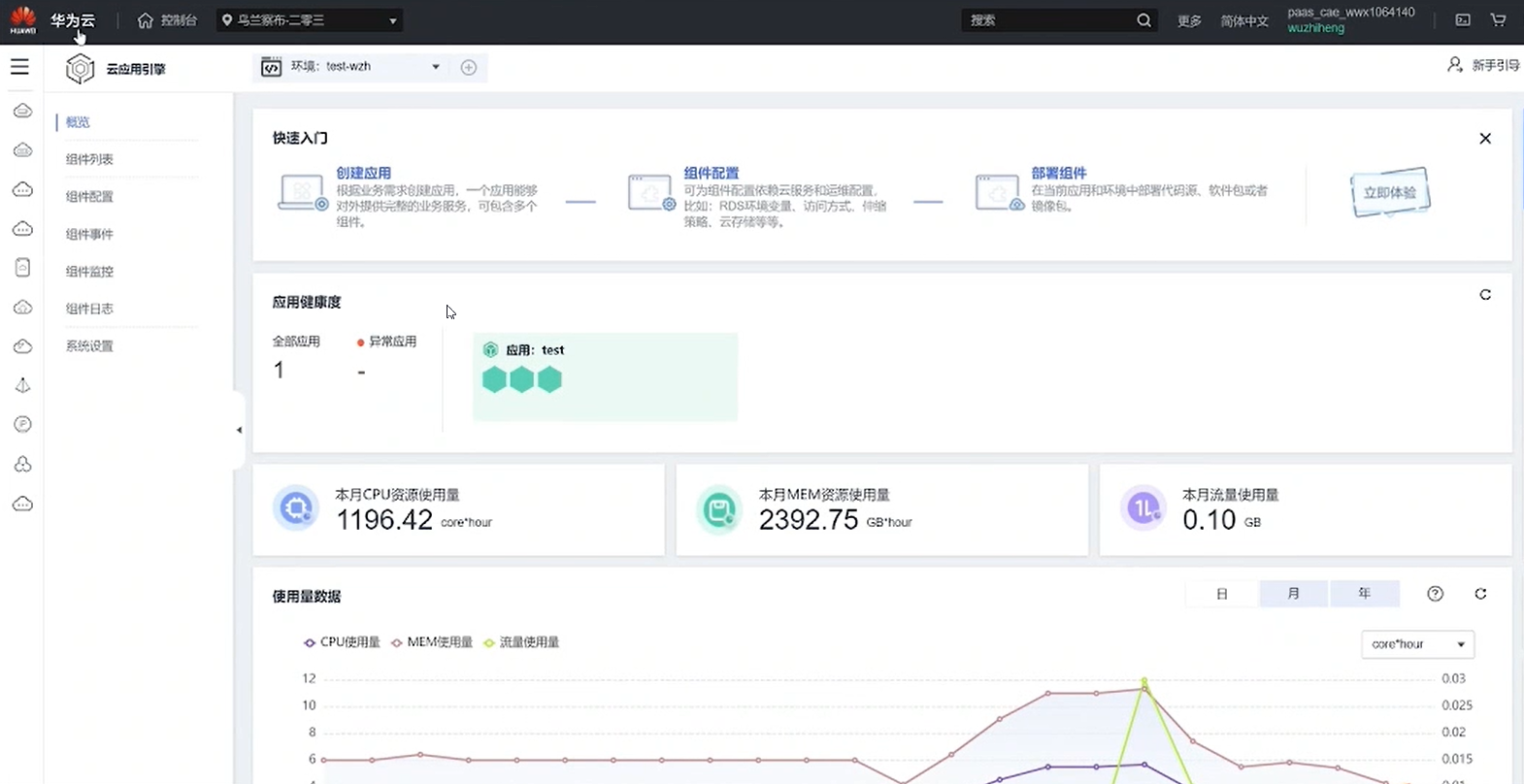 1. 登录 CAE 控制台,在“概览”页面可以查看组件健康状况以及资源使用情况等。