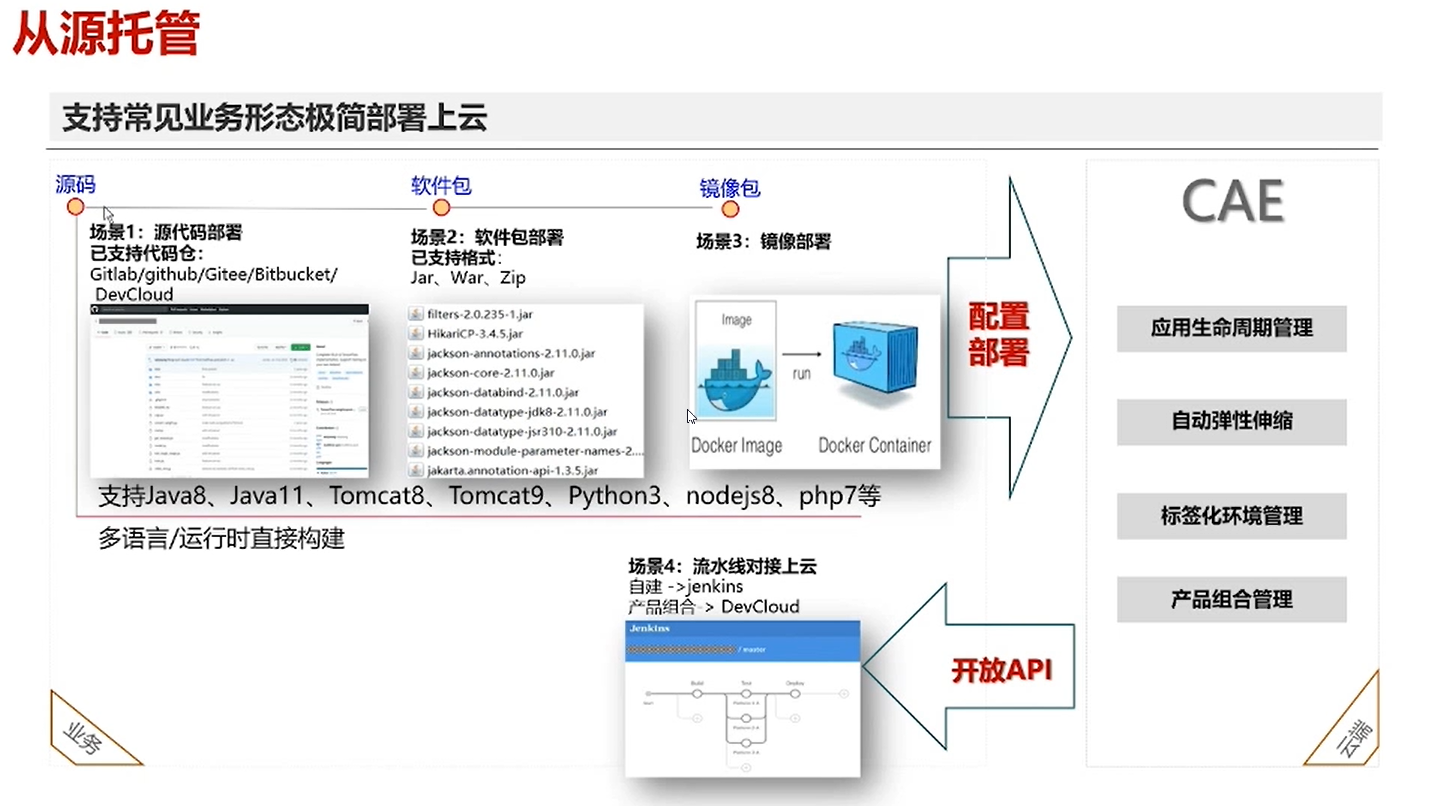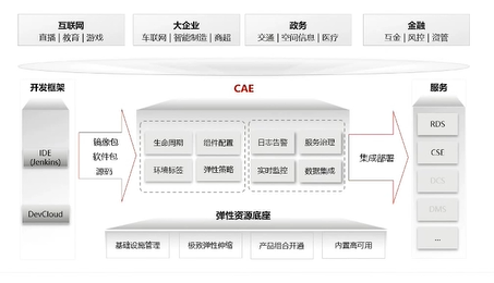 CAE(Cloud Application Engine 云应用引擎),一个面向应用的 Serverless 托管服务,可提供极简集成与部署、极低使用成本、免运维能力(免基础设施运维)的一站式应用托管方案,支持从源码、软件包、镜像包等集成发布应用,提供秒级弹性伸缩能力,是一款按量付费的云服务产品。可做到基础设施免运维,根据可观测的运行指标对应用进行生命周期管理。