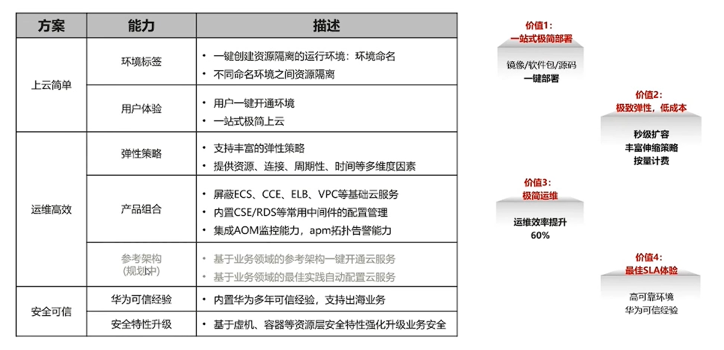 • 安全可信:华为可信经验和安全特性升级。内置华为多年可信经验,支持出海业务,基于虚机、容器等资源层安全特性强化升级业务安全