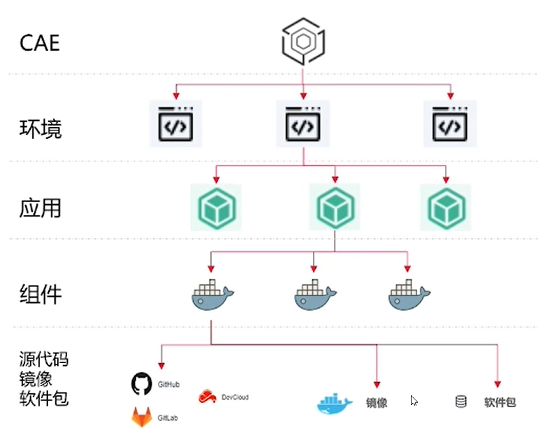 CAE 可以创建多个环境,比如测试环境、灰度环境和生产环境。每个环境下可以配置多个应用,每个应用由多个组件构成,每个组件就是一个个源代码、镜像或者软件包。