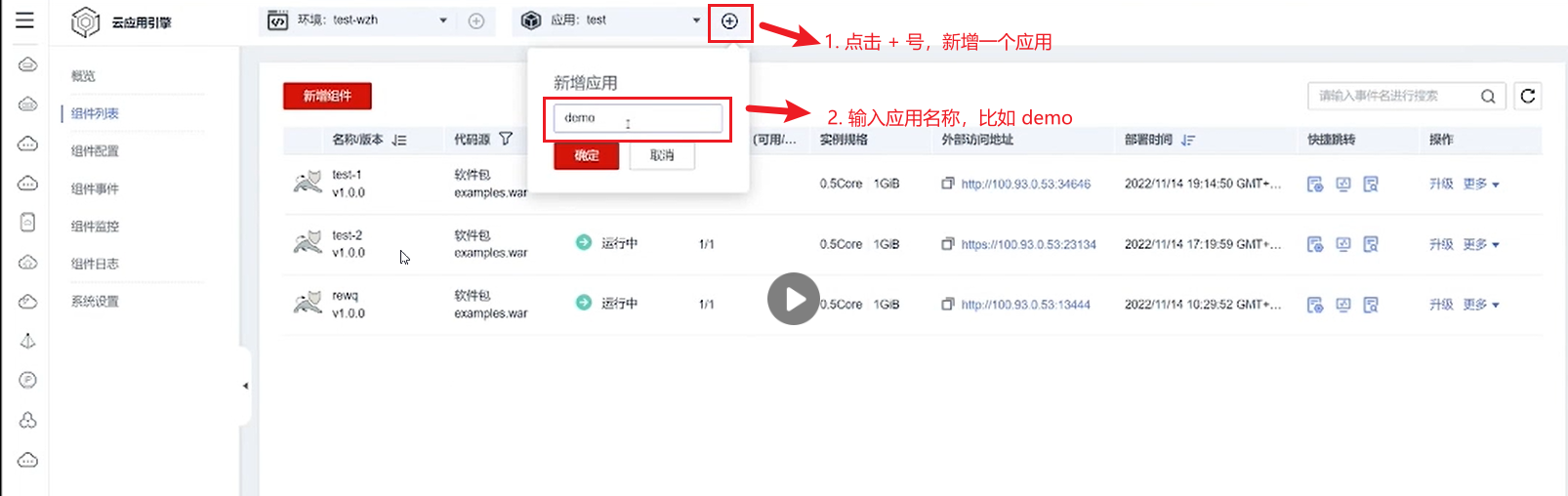 1. 登录CAE控制台,左方菜单栏点击“组件列表 ”,顶部“应用”右侧单击的 “+”号,可新增应用。