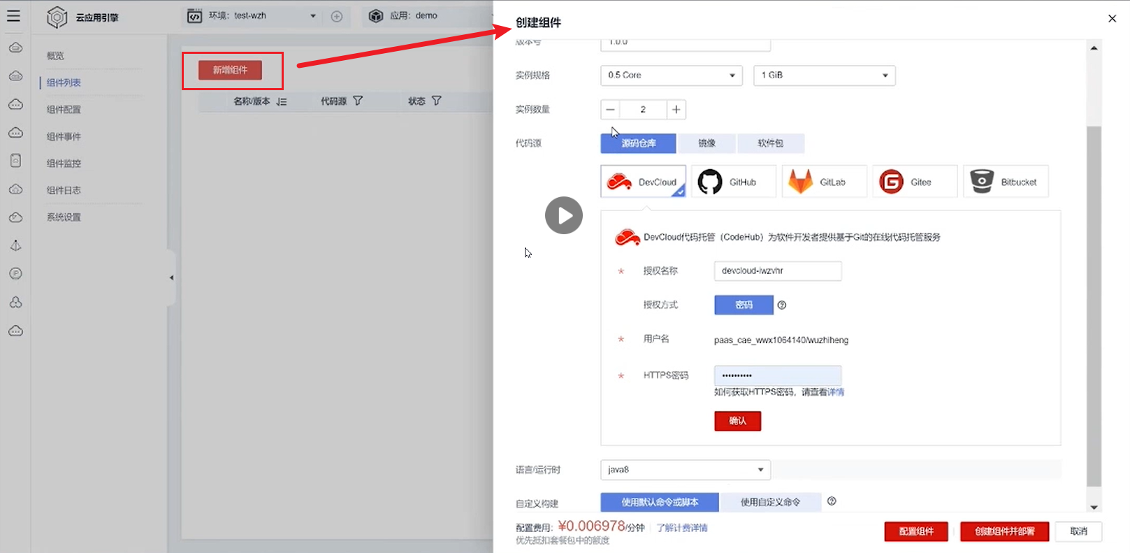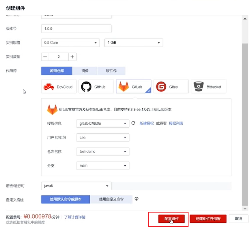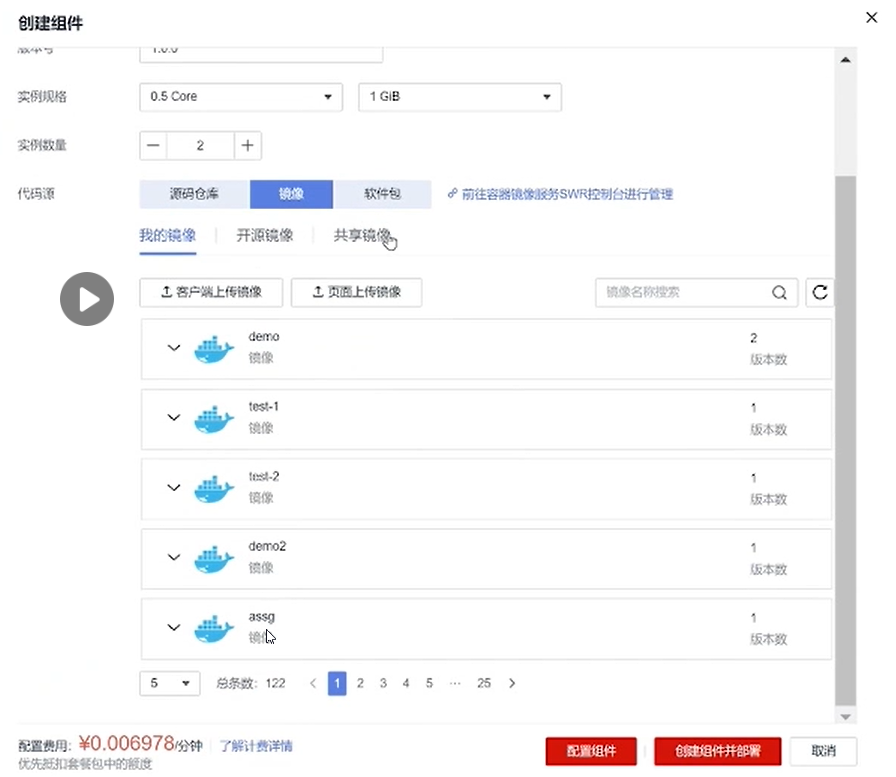 在组件界面,填充组件名称和版本号,支持选择实例规格:内核(0.5、1 或 2)和 1 GiB 和实例数量。