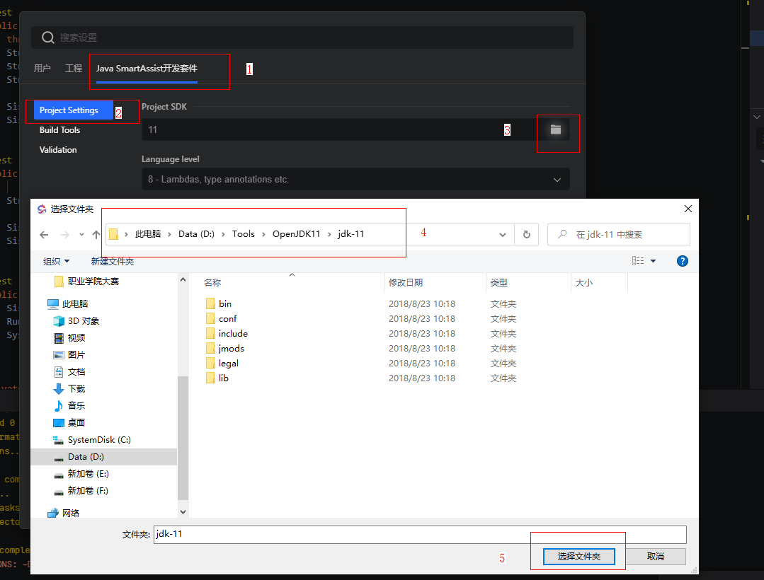 点击左下角的“管理”按钮,选择“设置”,在弹出设置选项中依次选择“Java SmartAssist开发套件”->“Project Settings”-> “Project SDK目录选择”-> 找到刚刚JDK的解压目录 ->选择文件夹,此时工程右下角会显示加载JDK,需要稍等片刻