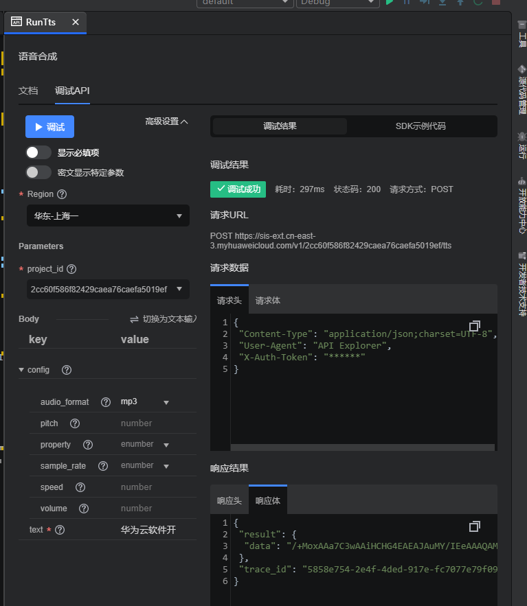 - 输入需要合成的文字,例如“华为云软件开发生产线”,选择audio_format为.mp3,点击“调试”按钮,可以看到API的调试结果,可以看到“调试成功”,查看右下“响应结果”的“响应体”页签,可以看到返回的结果,“data”是音频的base64编码。