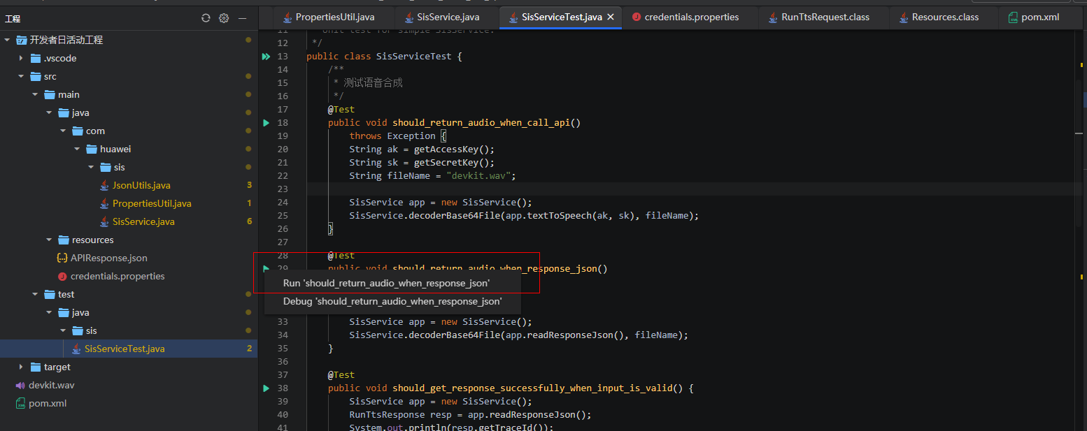 - 找到test目录下的测试类SisServiceTest.java,点击找到方法“should_return_audio_when_response_json()”,点击“Run‘All in SisServiceTest’”,最后可以看到目录下生成的音频文件。