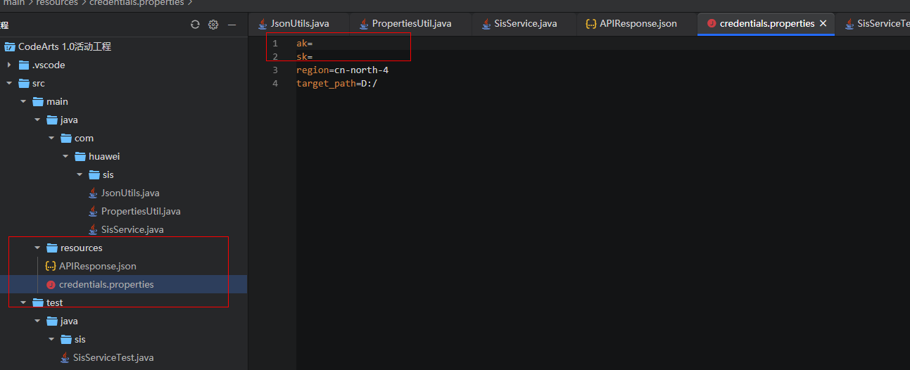 代码访问API需要AK/SK,参考文档获取用户AK/SK,将其输入到resources文件夹下的credentials.properties文件中的ak、sk中