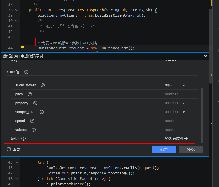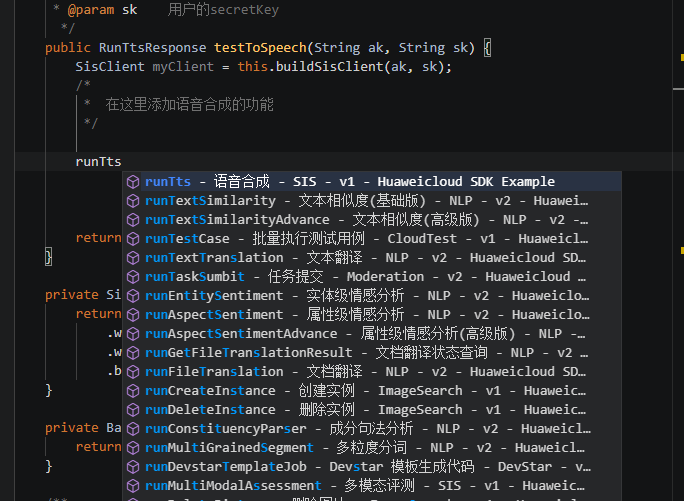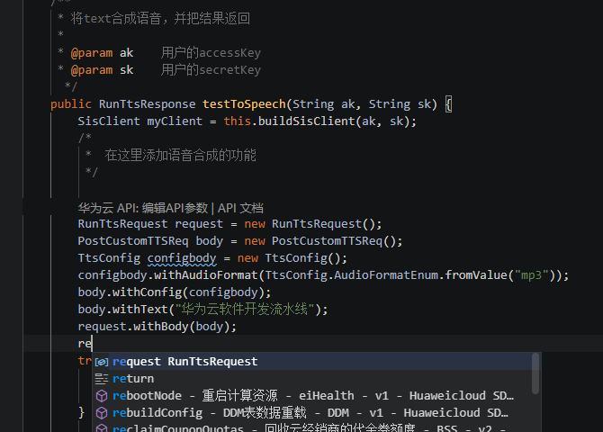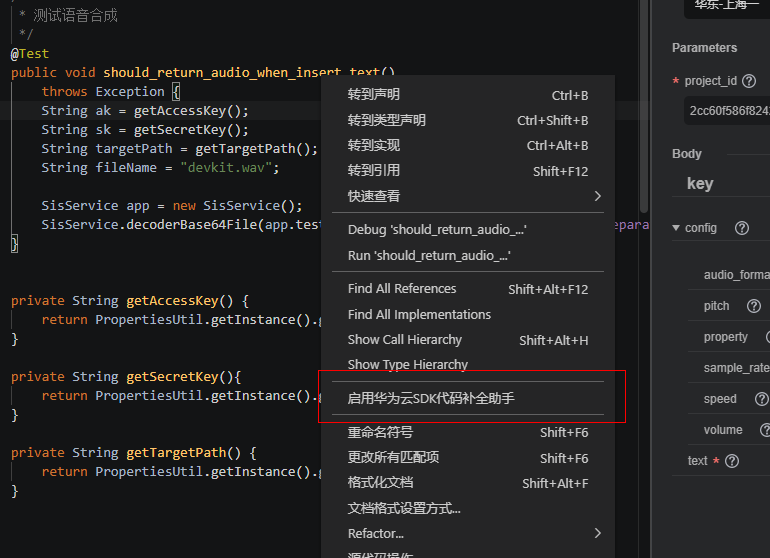 - 在editor中点击右键打开菜单,选择启用“华为云SDK代码补全助手”,在IDE中输入RunTts,DevKit会自动帮你联想出合适的API,选择RunTts,DevKit会帮你自动把SDK调用实现,并且将代码中涉及到的依赖自动import