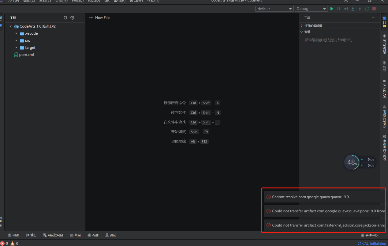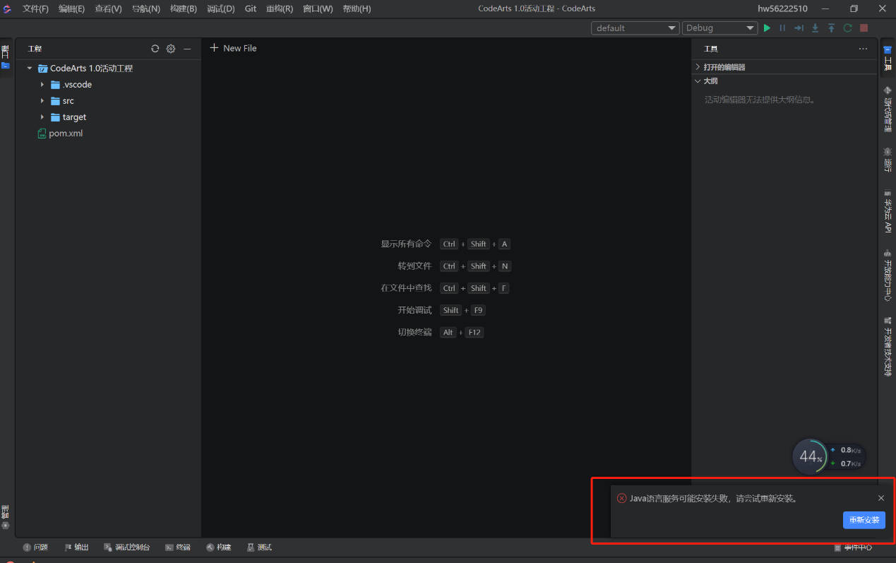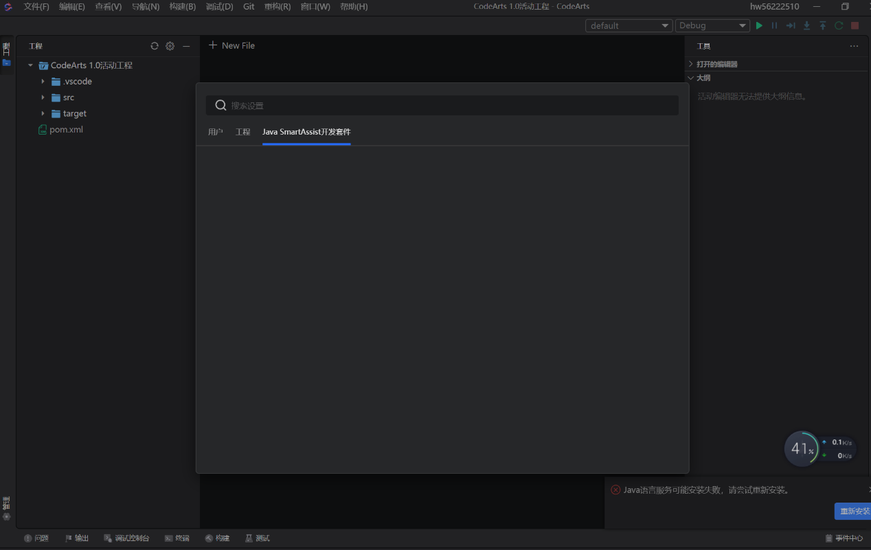 原因可能是因为Java语言服务初始化失败导致,彻底解决改问题,找到C盘/用户目录下的.codearts文件夹,删除language-server文件夹,重新启动CodeArts IDE客户端,此时会重新加载Java语言服务