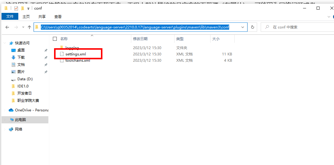 点击下载最新的配置(settings.xml),将此目录(C盘用户目录下找到.codearts文件夹,然后按照此路径找到settings文件.codearts\language-server\2210.0.17\language-server\plugins\maven\lib\maven3\conf)下的文件替换
