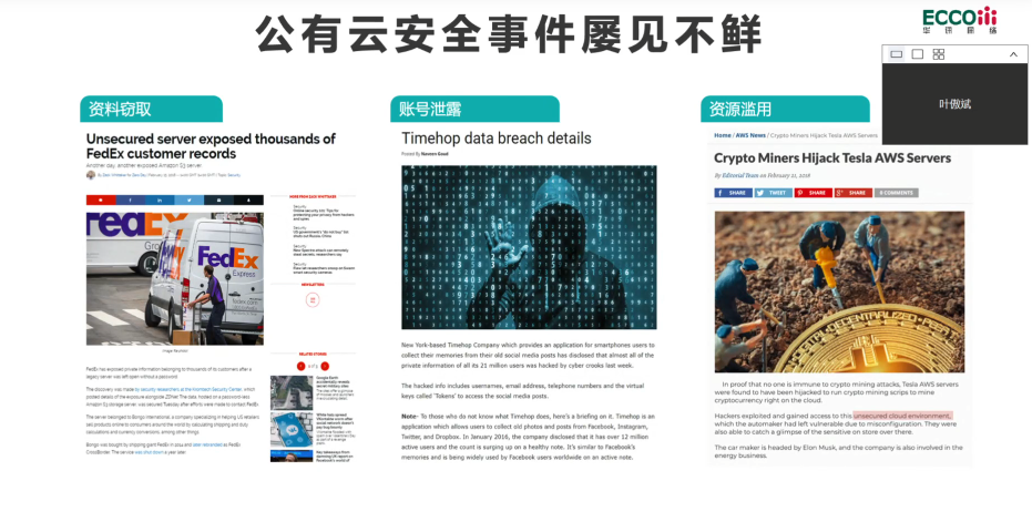 首先来看一下云安全的概览,从公有云大规模使用IaaS、PaaS等方式交付,就不断有云安全事件爆发,下面列举了近年来三个公有云重大安全事件。