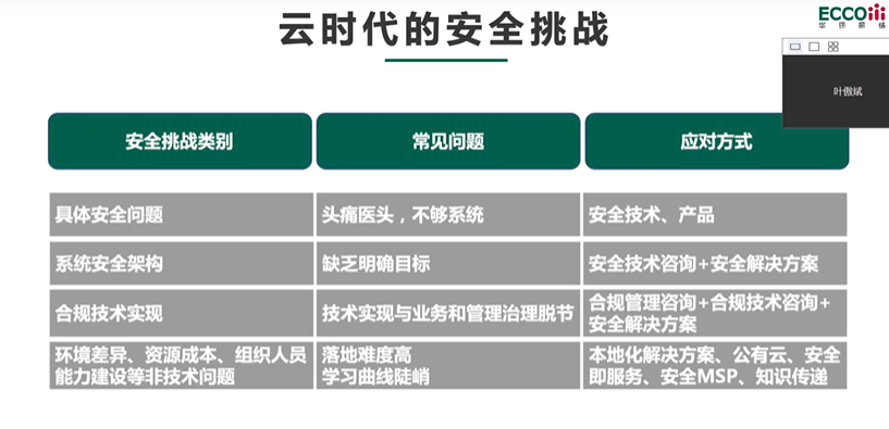 最后,由于环境差异大、资源成本、组织人员能力建设等非技术问题导致的安全建设落地难度高,学习的曲线陡峭。对此需要新的方案,如通过本地化、公有云、安全即服务的服务化以及安全托管和安全培训等知识传递的过程来进行补齐整体解决方案。