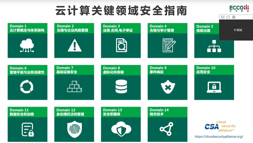 通过CSA(云安全联盟)发布的云计算关键领域安全指南,可以看到云计算的安全体系由最主要的14个安全域来构成,包括安全的云计算架构、企业安全的风险管理、法律法规、合规审计的需求以及信息和数据治理、管理业务的连续性、基础设施的安全等14个管理域。