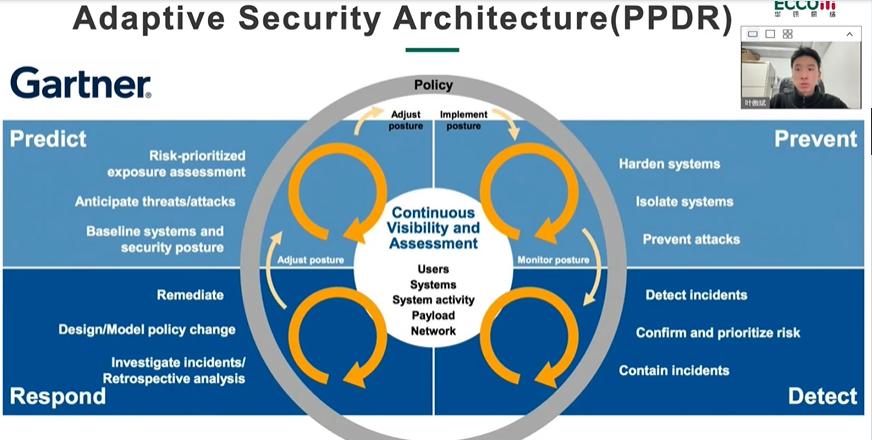 首先根据Gartner提出的PPDR模型,自适应安全架构由四个阶段组成,分别是预测、预防、影响和检测,这四个阶段建设再加上安全政策和合规措施,就可以创造了一个在源头快速发现和应对可疑行为的体系。