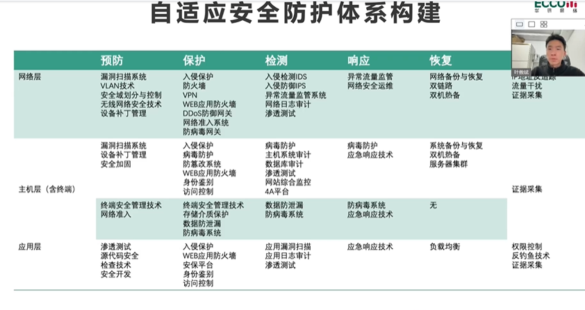首先第一个是网络层,网络层需要通过网络漏洞扫描或者网络安全域的隔离与管控、无线安全技术等来进行安全的防御,通过网络入侵防御、防火墙、WAF应用防火墙等安全组件来构筑网络安全防护能力。再通过网络入侵检测、网络日志审计以及网络层的渗透测试来不断检测网络中存在的威胁。通过网络可视化和网络安全运营流程对网络安全事件进行响应。最后还要确保网络的高可用性,从而达到随时恢复。