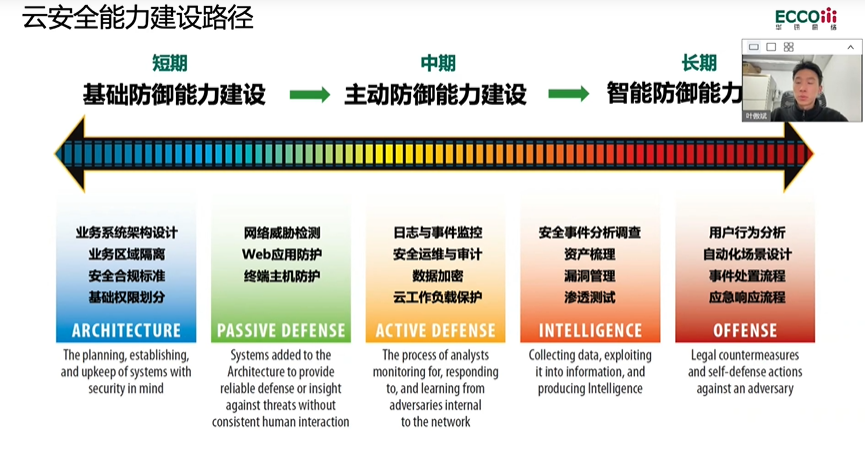 上面的场景同样适用于公有云,从短期基础防御能力的建设到中期主动防御的建设,最后成长为长期的智能防御能力体系。整个过程形成了整个安全能力建设的滑动标尺模型。