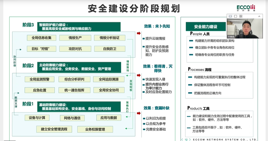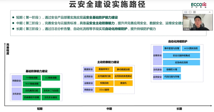 首先,第一个阶段是通过架构安全、基线检查、身份访问控制,建设过程中参考合规法案让企业优先拥有基础防御能力。