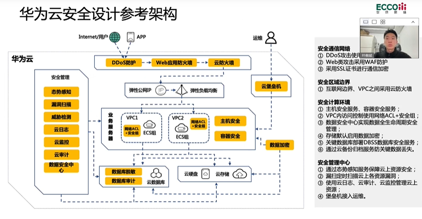 主机安全、容器和数据库安全防护、VPC内的最小化安全组访问控制策略以及默认数据加密构成了整体的一个安全计算环境。