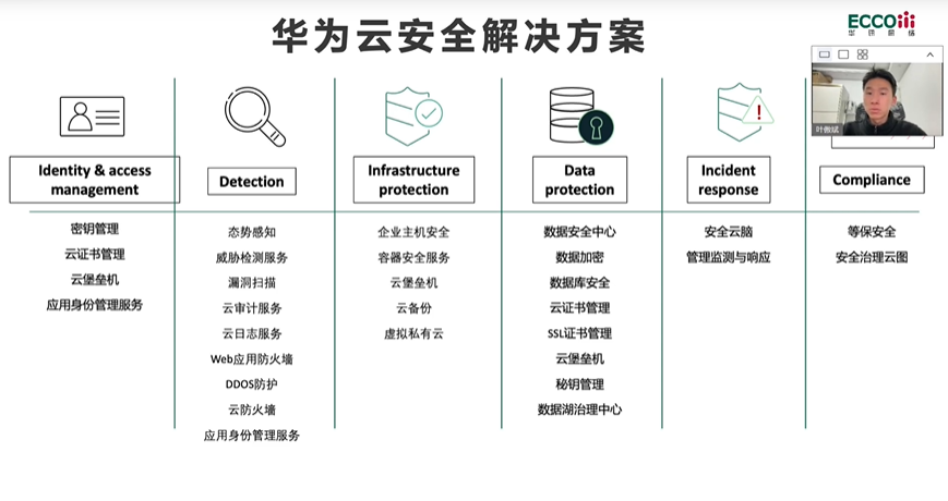 在数据保护层面,华为云拥有数据安全中心做相关的数据审计和数据使用阶段的一个透明和加密,还有像数据库安全、云证书管理、ssl证书管理、云堡垒机、密钥管理等。