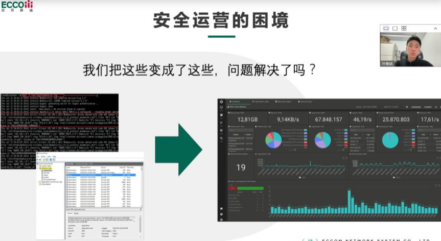 首先,SIEM(安全事件管理平台)是安全运营的核心技术工具,他负责收集各类审计日志、操作日志、安全工具日志,如何用好SIEM是进行安全运营的关键一环。而目前企业进行SIEM建设往往会遇到以下问题,可以看到上图左右是原始日志信息,右边是非常多彩统计分析报表,这样把防护数据、审计数据最后变成了一张报表或者统计分析图,安全运营和安全事件发现的能力增长了吗?安全设计处理的能力提高了吗?最后安全运营的问题解决了吗?