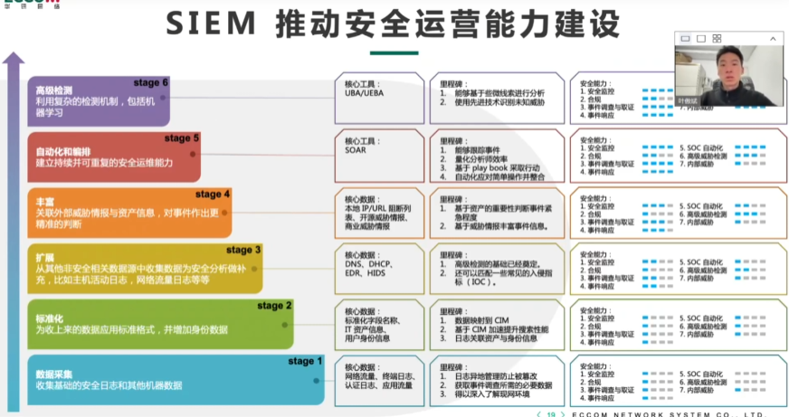 所以需要给客户从自下而上的建设思路来完善SIEM平台。首先是基础安全工具和安全日志的数据收集;其次是将采集数据进行标准化建模和归一化处理;下一步是将主机日志和网络流量日志也补充来完善事件调查过程中的溯源和关联分析;最后通过外部威胁情报数据的丰富资产数据和漏洞数据进行一个比对,进行风险的管理。接下来将自动化编程、自动化流程编排和响应能力加入到SIEM,这也就是SOAR(自动化响应和编排)功能,这样的话在运行过程中部分重复性工作或者自动化判断的流程就能够交给机器来做,从而减少误报释放安全运维人员的工作量。最后还要加上复杂的检测机制,包括基于AI的用户异常行为分析,安全动态基线模型来完成智能化的检测和响应,基于微线索可以进行分析并且尝试识别出未知的高级的APT攻击。