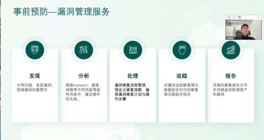 首先在事前预防这方面,华讯提供了漏洞管理服务,会从漏洞发现、漏洞分析、漏洞处理和修复,再到漏洞追踪、漏洞报告来给客户和用户提供一整套全生命周期管理方案。