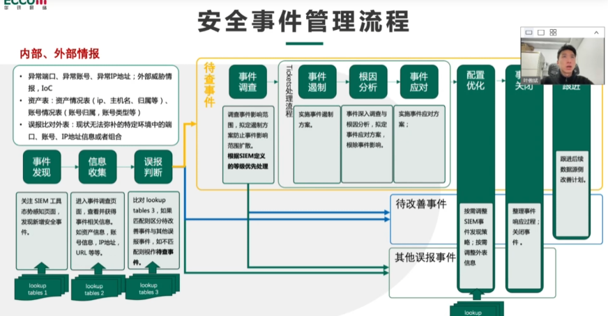 首先会在安全云脑或者说SIEM工具上面、态势感知页面或者高危事件发现页面,需要去做一个事件调查,并且查看相关的信息,比如攻击事件相关联的资产是哪一台?相关联的用户是哪一位?这需要对比资产和用户丰富的数据来找到对应的责任人,去进行安全分析,判断他是否是一个误报,那如果是误报的话会直接进入优化的阶段,排除并且遏制。那么如果是实际存在风险需要调查,事件会进入待事件调查的流程,会进行事件的调查,根据SIEM定义的等级优先级去做处理,会去根据事件告警触发的量去做对应的事件遏制,来确保不会造成告警泛滥。