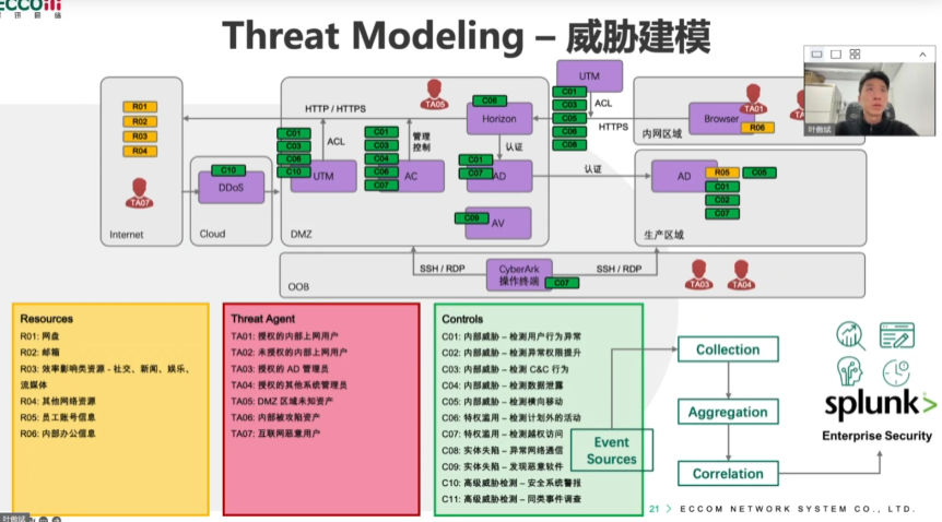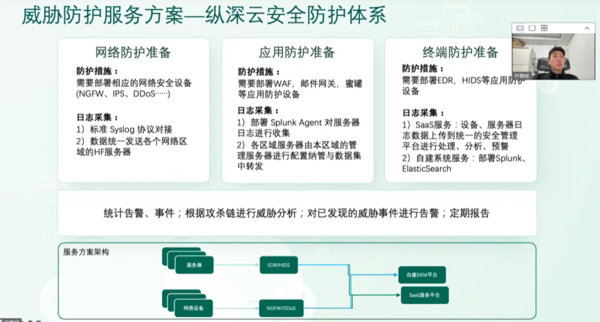 在整体防护方案中有三部分准备,第一个部分是网络防护准备,需要部署刚刚提到这些安全设备。还需要把syslog对接到SIEM平台上面来;应用防护的准备,需要有WAF、邮件网关、密罐等防护措施;在终端层面会部署EDR、hids等终端的防护措施。最后安全威胁的管理会帮助客户去实时监控和统一威胁建模,来帮助客户基于这些防护准备去做实时的威胁发现。
