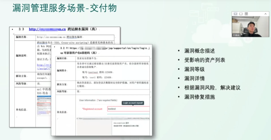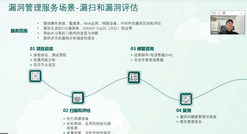 在流程上,首先华讯会在项目启动前来签订保密协议和测试授权,之后会进行实际的扫描评估,来准备漏扫的资源,最后等到修复阶段完成以后,会进行专家现场答疑或者邮件的答疑。到最后根据修复的情况,会提供复测服务来看到用户到底实际修复了哪些漏洞,还有哪些漏洞是继续存在还需要去跟进。