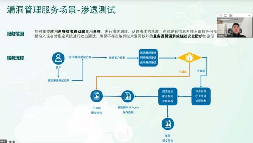 漏洞渗透测试的服务流程:首先会确定渗透测试范围,讨论和修改渗透测试方案,得到客户授权之后会去进行相关漏洞的渗透,最后如果没有漏洞,会不加固直接提交报告;如果有漏洞会通过漏洞的信息获取,远程控制的方式去提交报告或者配合用户进行加固。最后在渗透测试结束以后,会清除渗透测试所用到的脚本和创建的账号。