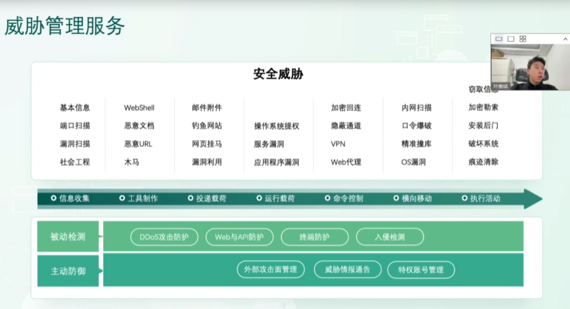 在防护的事中,华讯提供威胁管理服务。首先安全威胁来源于以下的几个阶段,从MITRE ATT&CK框架里面提到的信息收集、工具制作、投递载荷、运行载荷到命令控制,横向移动并且执行入侵的活动,可以通过被动检测和主动防御两种措施来进行威胁的发现和防护。